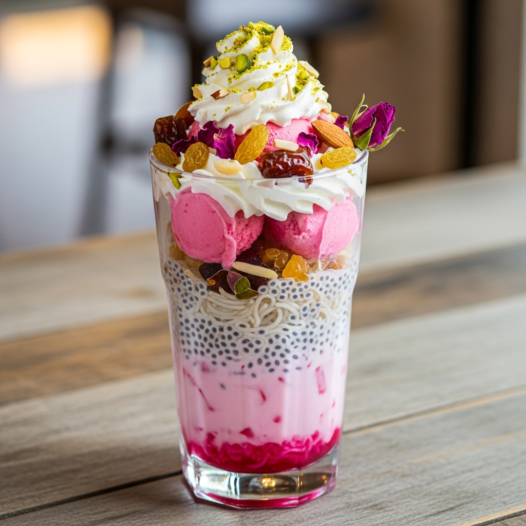 Sweet dessert drink with milk, rose syrup, thin noodles, basil seeds, and ice cream