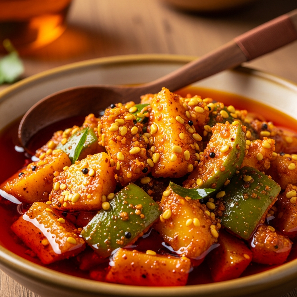 Tangy, spicy condiment made by preserving raw mango pieces in oil, salt, and spices.